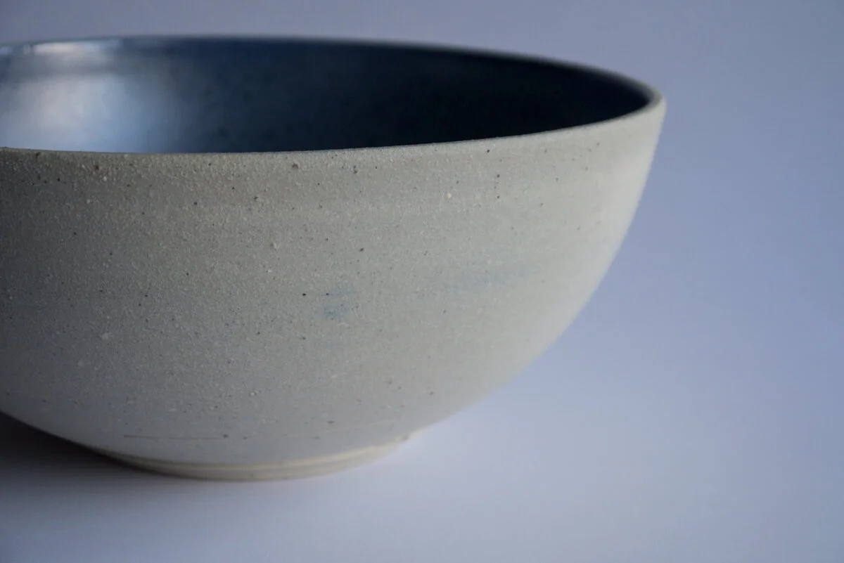 Material: The bowl is wheel thrown using stoneware clay. It is finished with 2 cobalt based glazes and fired to cone 6 (1225 deg. C).